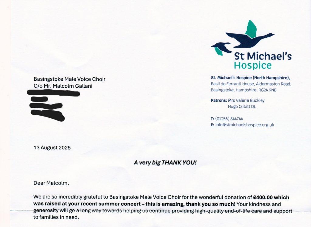 Our next concert is on the 18th October and is a joint concert with the Basing Singers in aid of the Ark Cancer Charity. More details can be found on the Concerts page.