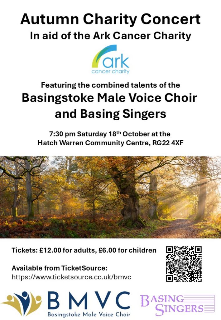 Our Autumn concert will be a joint concert with the Basing Singers and will be held at the Hatch Warren Community Centre on October 18th. Doors will open at 7:00 pm, ready for a start at 7:30 pm.